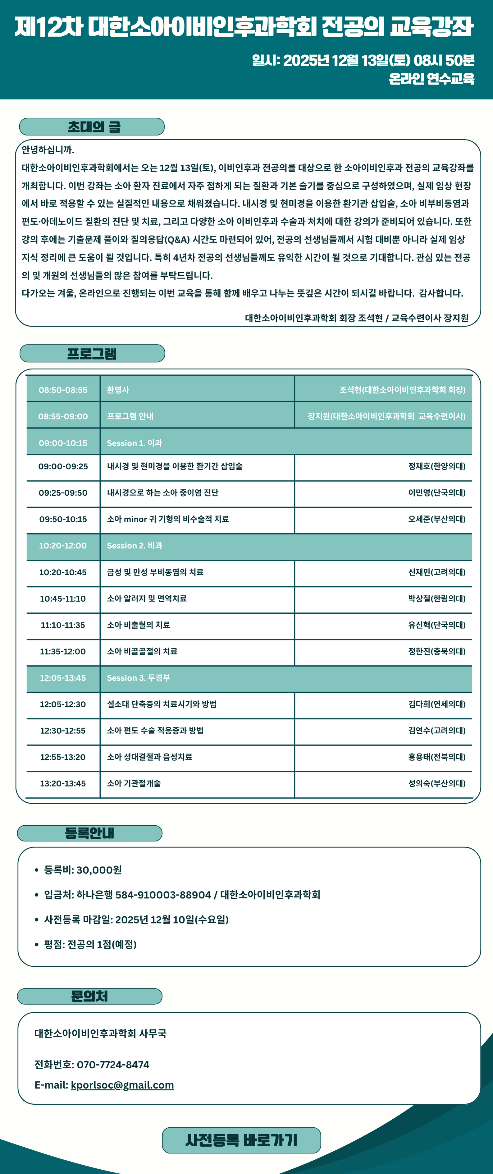 | → | 2025-12-13 | 제12차 대한소아이비인후과학회 전공의 교육강좌 | 온라인 연수교육 |